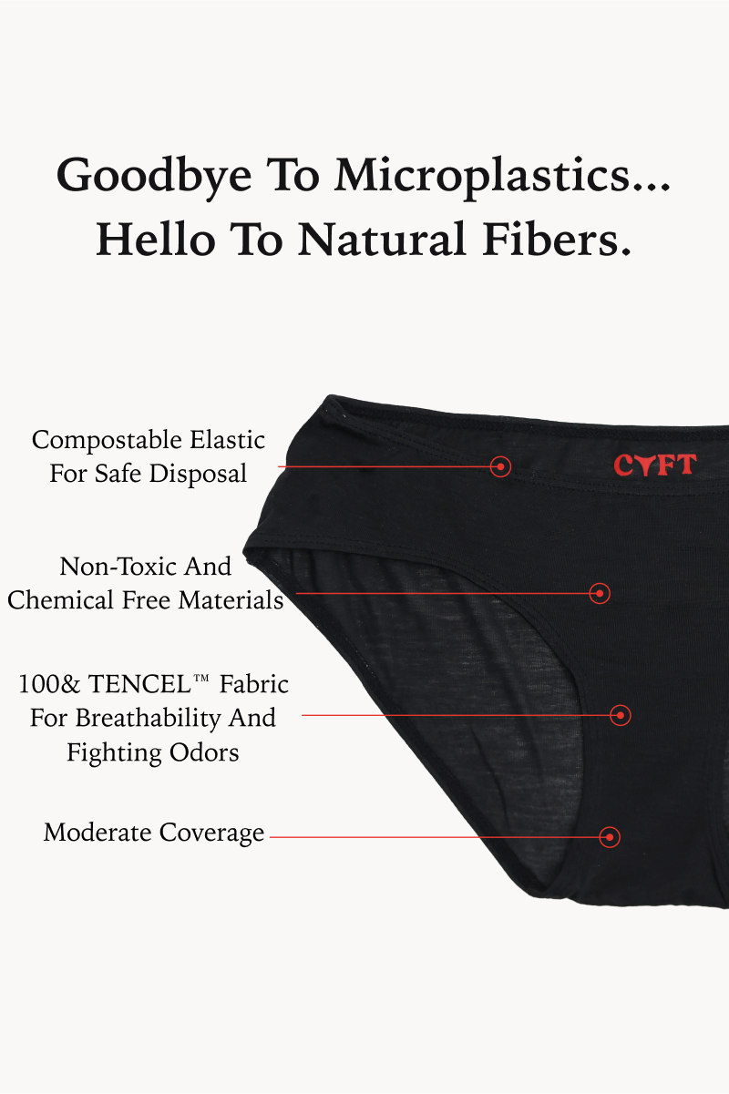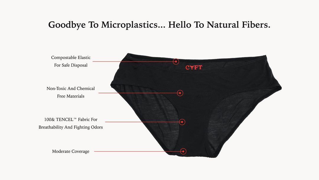 CUFT® is crafted from 100% TENCEL™ fabric, designed to be both compostable and disposable. We avoid toxic synthetic and polyester blends commonly used in durable industry-standard underwear, resulting in a garment that performs differently and may be less long-lasting (average of 10-12 months).